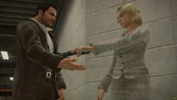 As Frank approaches the door to Paradise Plaza, he hears a sound coming from behind him. Preparing for the worst, he picks up a Fire Extinguisher and swings it at the source, narrowly missing Jessie, whom he had mistaken for a zombie. Startled, Jessie stumbles backward and sprains her ankle, hindering her mission to assist Brad, who was last seen being fired upon in the Food Court. Frank convinces Jessie to let him take her place and she gives him her Handgun. Before they part ways, he insists that afterward, they are going to have a chat once the commotion is over.