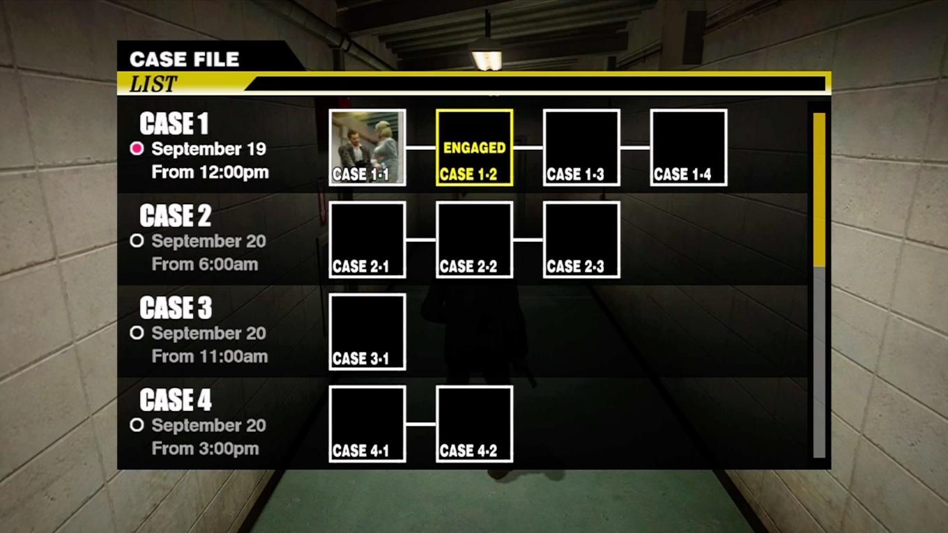 Cases are the main storyline missions, covering the events that lead Frank West to the truth behind the zombie outbreak in Willamette. When Frank finds out about a case, the case file screen appears. The case panels inside the case file screen list important information, such as if the case is pending or engaged, if it has been solved, or if it has expired. The case file screen can be accessed at any time by pressing