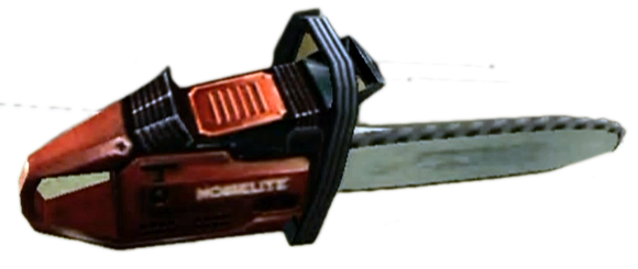 - The word "HOMELITE" is stenciled on the side of the Chainsaw, referring to the real-life worldwide power equipment manufacturer Homelite Corporation.