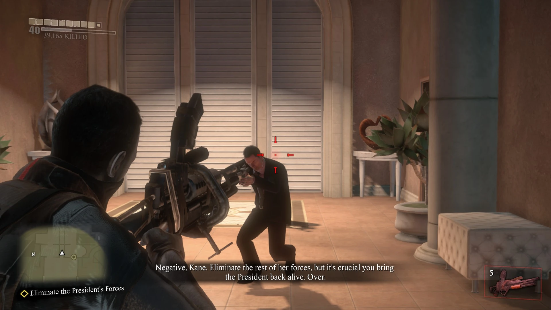 Once Adam Kane tracks the president to the Mayor's Mansion in Sunset Hills, he will find the area completely barricaded. Adam can try to enter the mansion through the backyard, but will be ambushed by the president's guards.