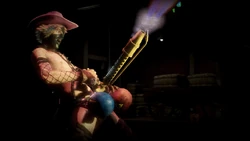 , Nick will hold the Lust Cannon in between his legs and will spew fire in a straight direction; the weapon's angle can be changed while firing. This attack will change the Lust Cannon's ammunition to flame rounds.