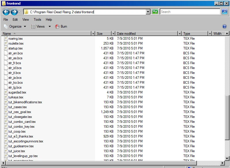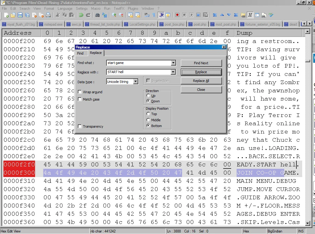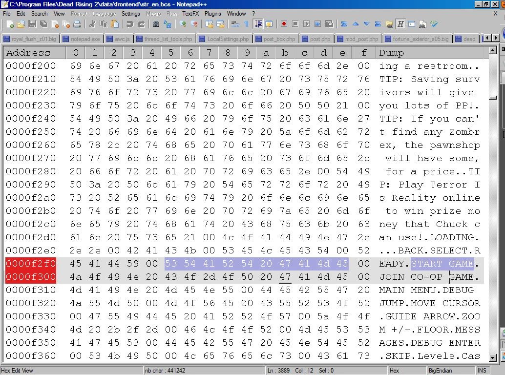 data/frontend/str_en.bcs Many of the files which contain game text are stored as binary/hexadecimal files, and a Hex Editor is highly recommended if you intend to go about editing these files. For the purposes of this guide, we'll be changing the file 'data/frontend/str_en.bcs', which can be found in your Dead Rising 2 install directory. This file contains the majority of the text encountered in the game with the language set to English, the other 'str_XX.bcs' files in this directory contain the text for other languages. The same principles here should be applicable across all language files. |