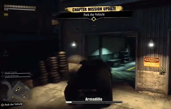 Once the Armadillo has been safely driven from the warehouse to the Ingleton Taxi Company, Adam Kane will need to park the vehicle safely in the garage. The garage is on the left as you enter the compound.