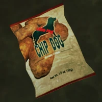 Snack appears to be a bag of processed potato chips called Chip Dog.