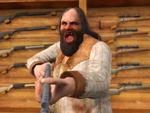 Frank West arrives to the Huntin' Shack to find James Ramsey trying to reason with the gun shop owner Cletus Samson. Cletus refuses to let the two men come any closer and shoots his shotgun as a warning. James claims that he just wants some guns so he can survive. Going against Cletus' warnings, he advances towards him and is killed with a buckshot to the chest as a result. James flies out of the store and Frank is left alone to battle Cletus.