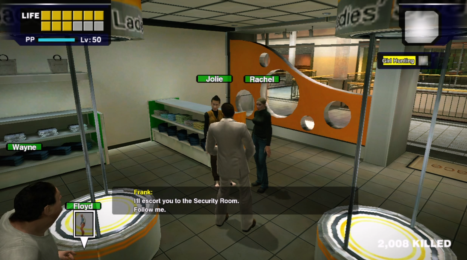 Frank: What? What happened to this RACHEL girl? Jolie: She got left behind on the 2nd floor... in LADIES' SPACE. The zombies probably already got to her. Frank: You said LADIES' SPACE right? I'll go check on her. Wait here, Ok? Jolie: ...