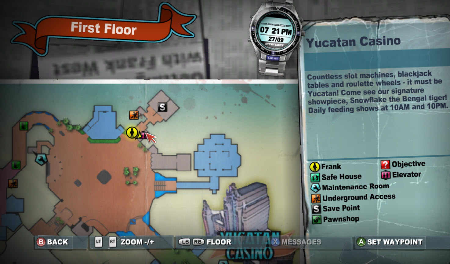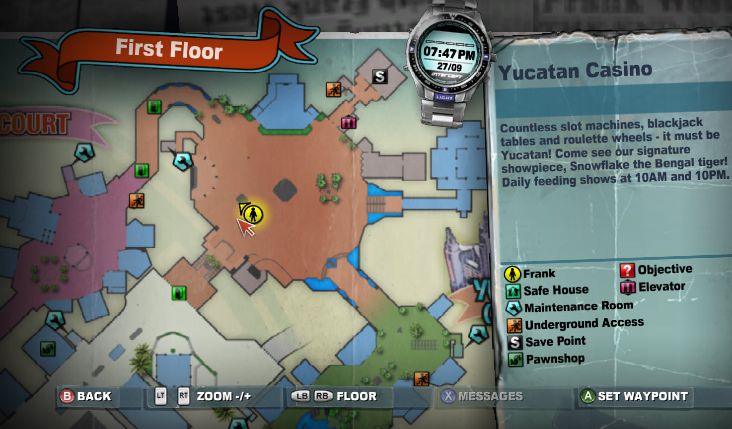 The Yucatan Casino is one of the major casinos of Fortune City in Dead Rising 2 and Dead Rising 2: Off the Record. Here, tourists and vacationers can indulge in games such as slots, Blackjack, and other card games. Among the slots and tables, a unique attraction awaits: a tiger exhibit featuring Snowflake, who puts on shows with her trainer, Theodore "Ted" Smith. However, as the outbreak occurs, Theodore snaps, attempting to feed Snowflake "fresh meat" in the form of humans. Chuck Greene realizes this when he is captured after spotting a man fleeing within the casino.